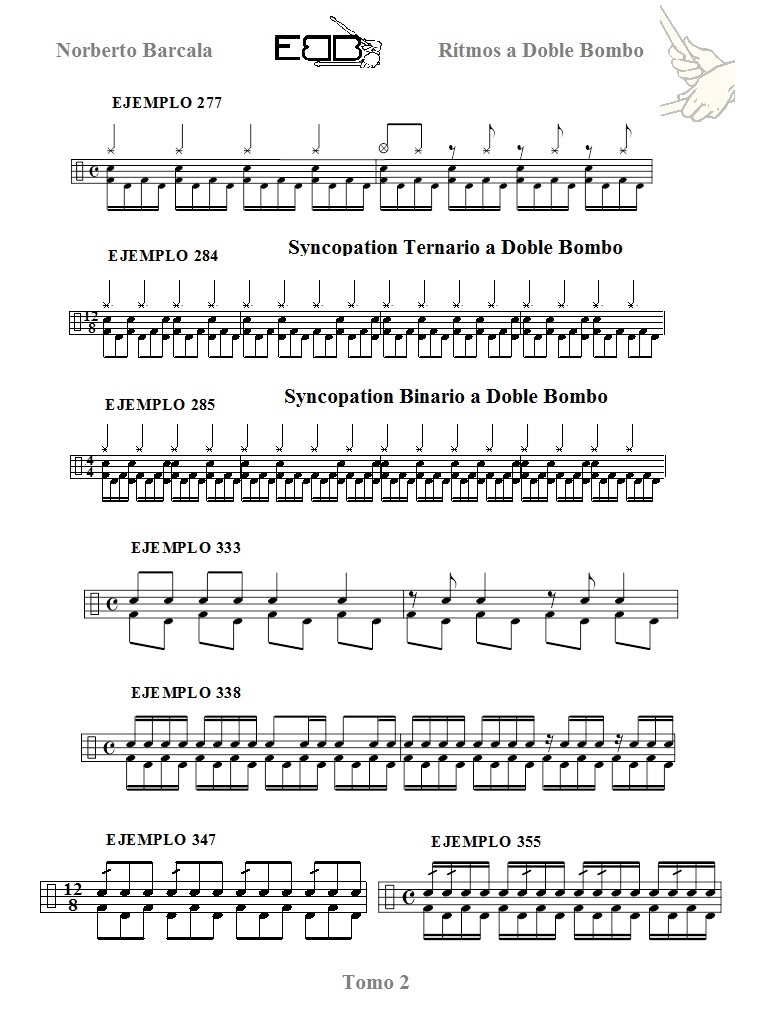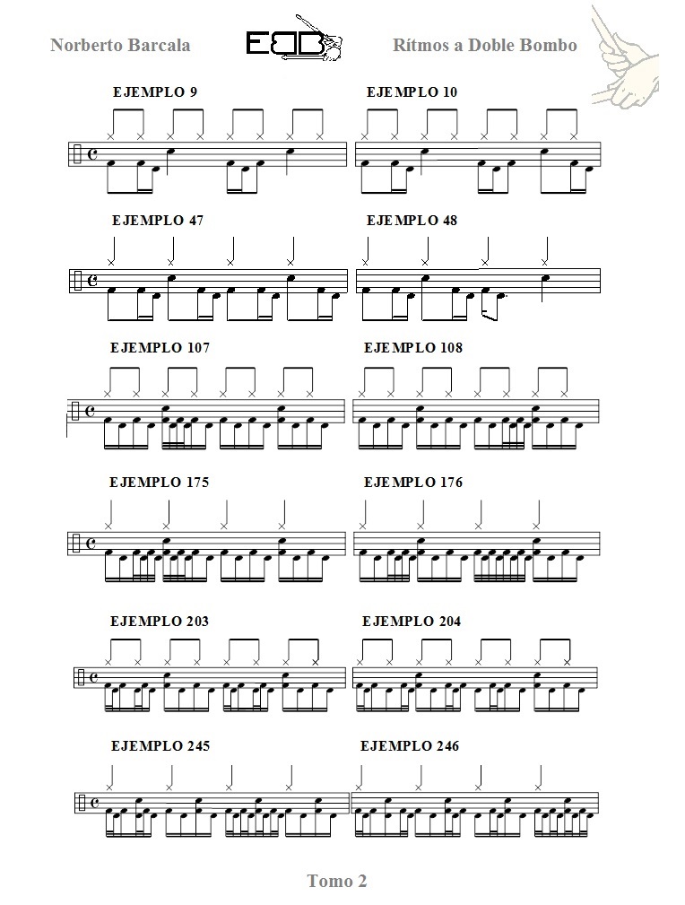 Para finalizar el estudio de Rítmos a Doble Bombo este libro contiene rítmos con base de bombos intercalados ( galope ) en los niveles 1 y 2.